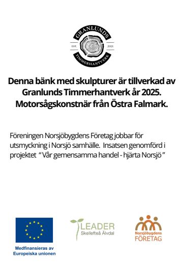 En helt unik motorsågad bänk med skulpturer pryder ”kommunparken”. En lekfull björn och en vis uggla, detaljerad in i minsta kvist blickar de ut över Norsjösamhälle.