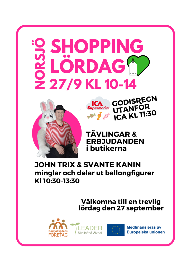 Lördagen den 27 september 2025 anordnade Föreningen Norsjöbygdens Företag tillsammans med handlarna ett shoppingvent. Det blev en trevlig lördag i solsken. ”John Trix” med Svante Kanin minglade runt och delade ut ballongfigurer till barnen. Godisregn blev det också. Butikerna med extraöppet, tävlingar och erbjudanden.
